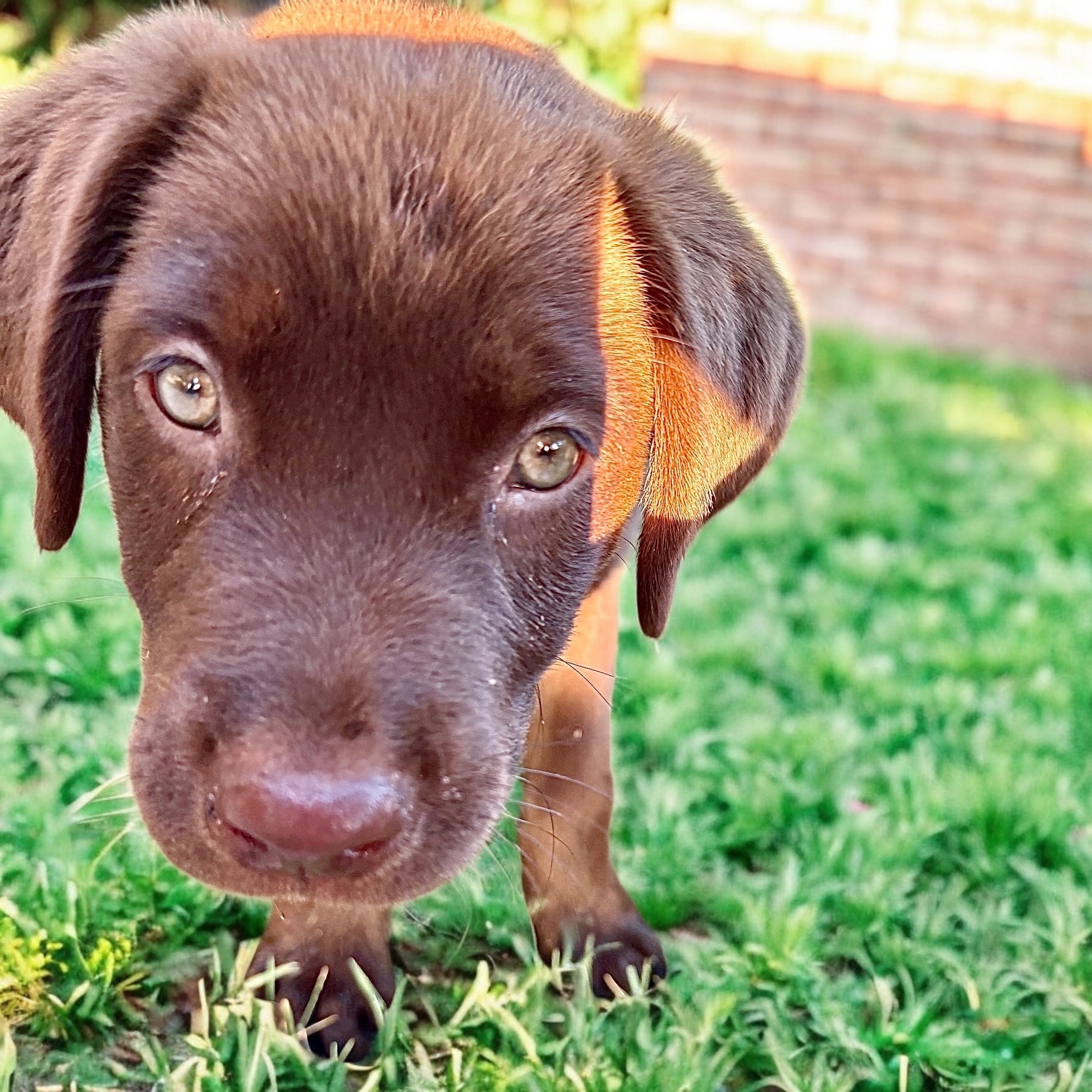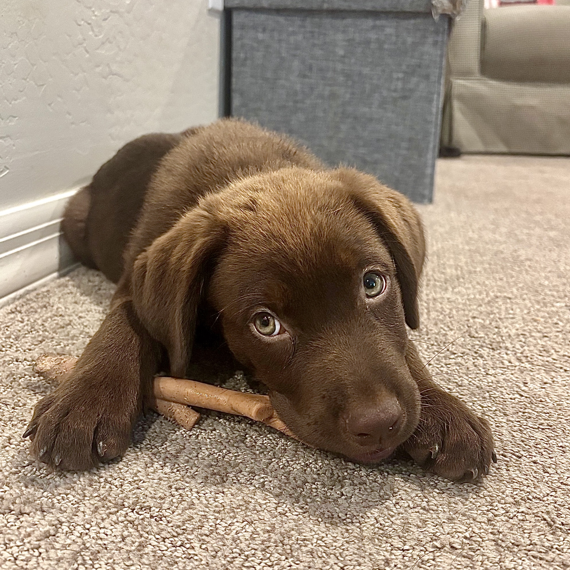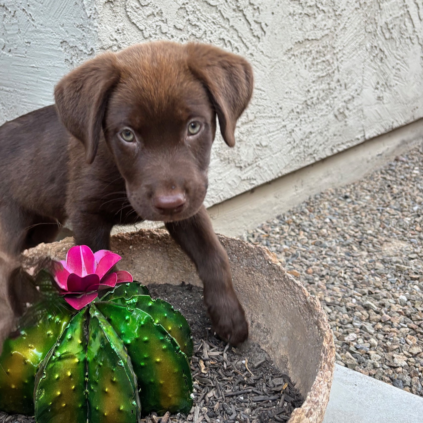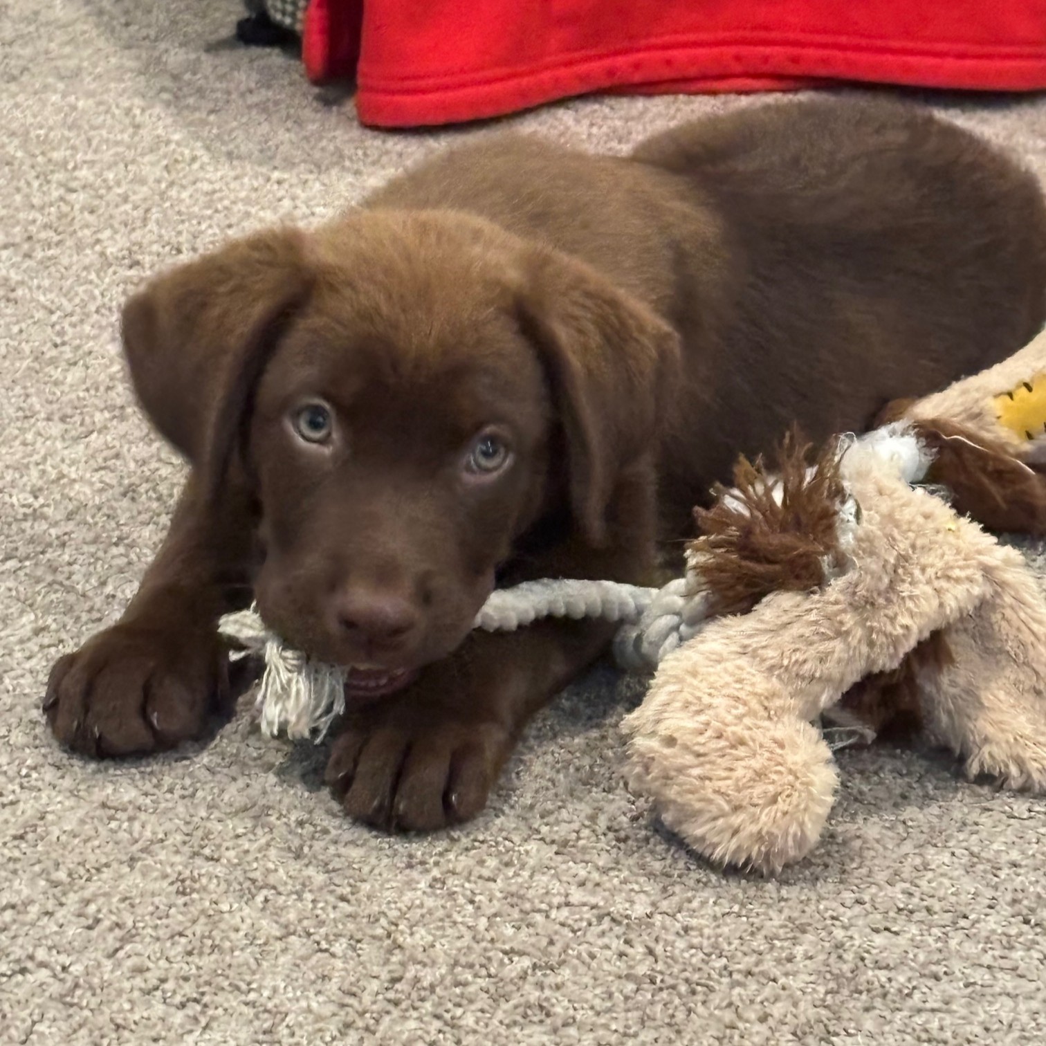 Cadbury or Caddie for short is a male 11-week-old chocolate lab. And he is as sweet as his name suggests. More cautious than his brother Klondike, Caddie’s soulful eyes will melt your heart—and the first thing he wants to do each morning is shower you with kisses!