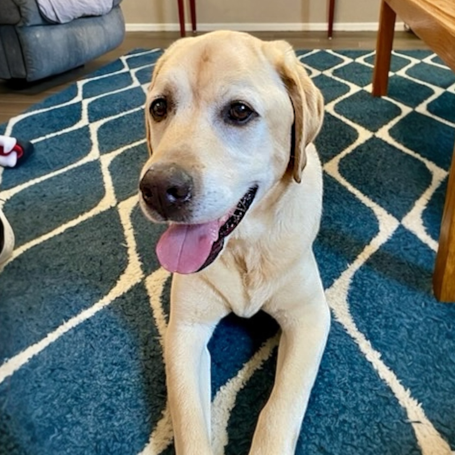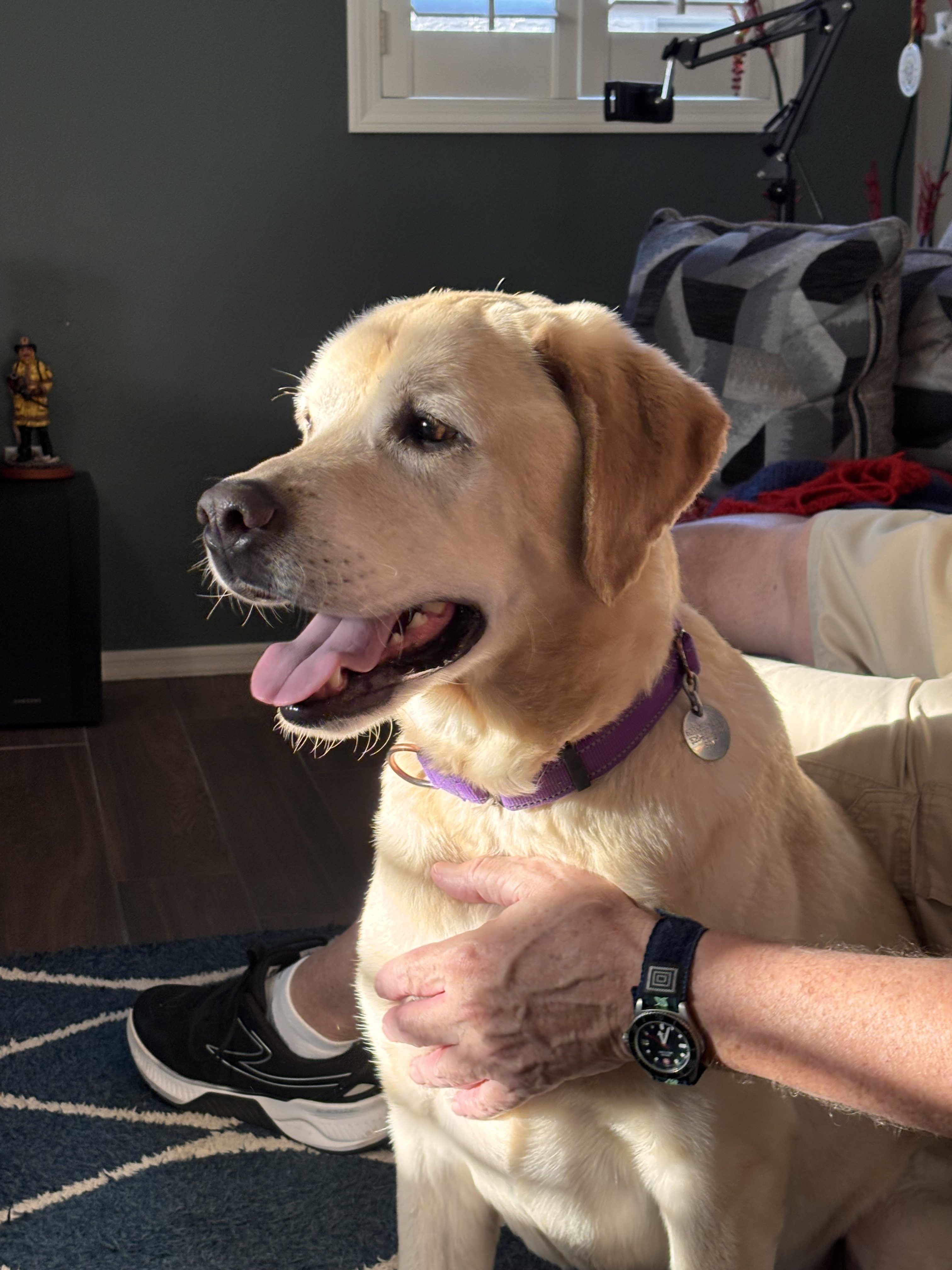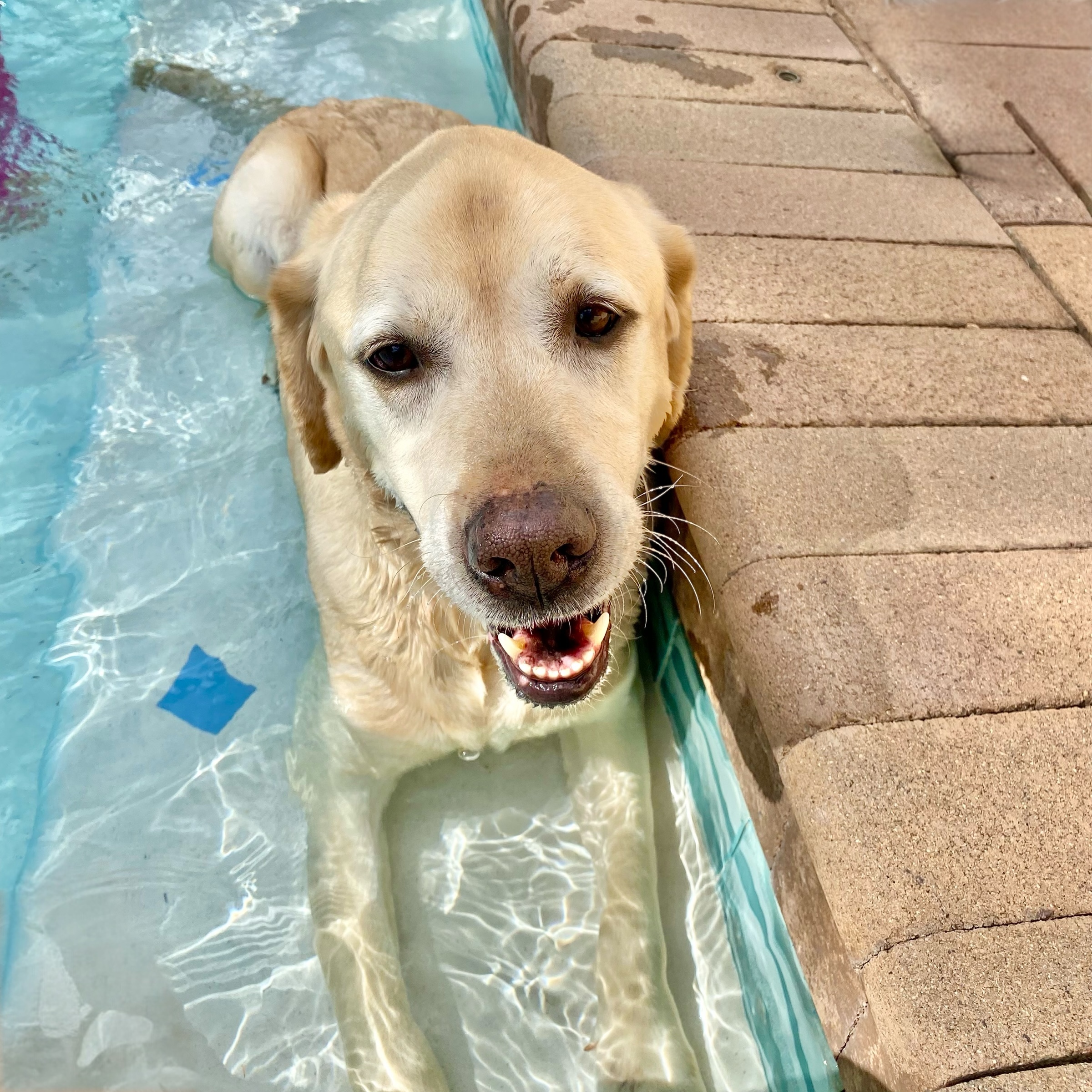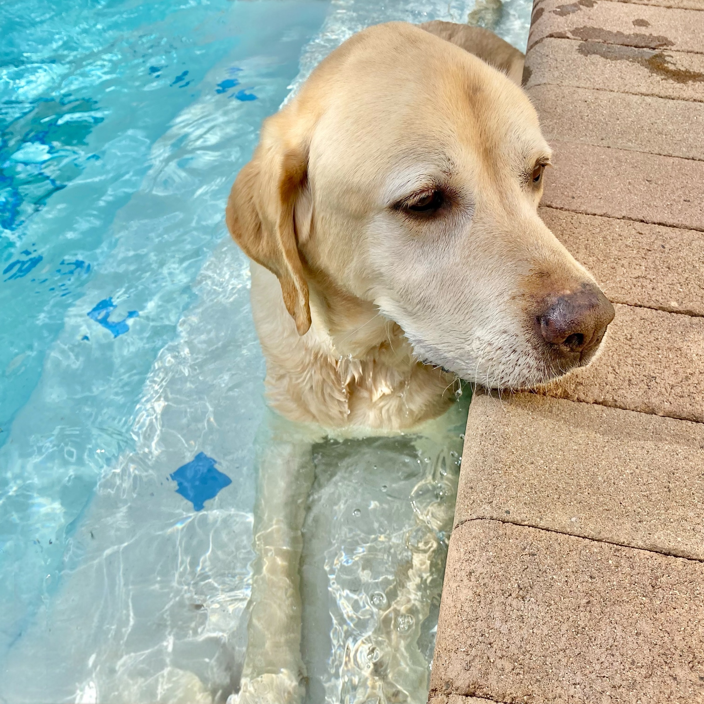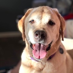 Finn is a youthful and active 73 lb, 8 y/o yellow lab that’s ready for his new forever home. He is housebroken and trustworthy when left alone. He is smart and food motivated, so he is expected to learn a doggie door quickly. He is crate trained but currently sleeps next to his fosters in his own bed. Finn is good with kids, has lived with other dogs in the past, and is even good with the resident cat. He knows his basic commands like sit, down, stay, off, wait, and come. Finn is eager to explore during our walks and is working on improving his leash manners. He does like to play fetch and tug-a-war and did enjoy cooling off on the top step of the pool. Finn hops right up into the car or truck and rides well to his next adventure. He loves to meet new people, especially if they have treats for him. Finn is calm around the house, willing to cuddle, or see what comes next. Are you in on the fabulous Mr. Finn?
